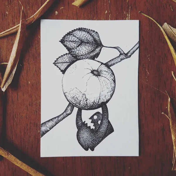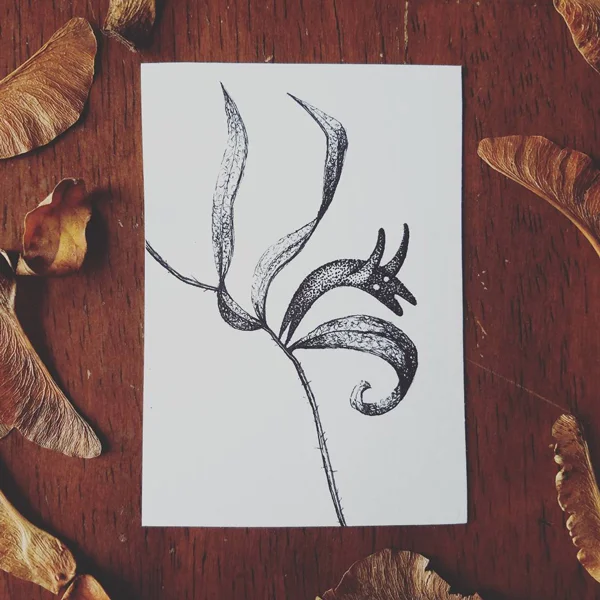A selection of inked artist trading cards from 2017's inktober series. For this series a new ink drawing was created daily during the month of October. 31 illustrations were created in total, each featuring the 'botanical buds' small kodama-esque characters with a special love for plants and botany.